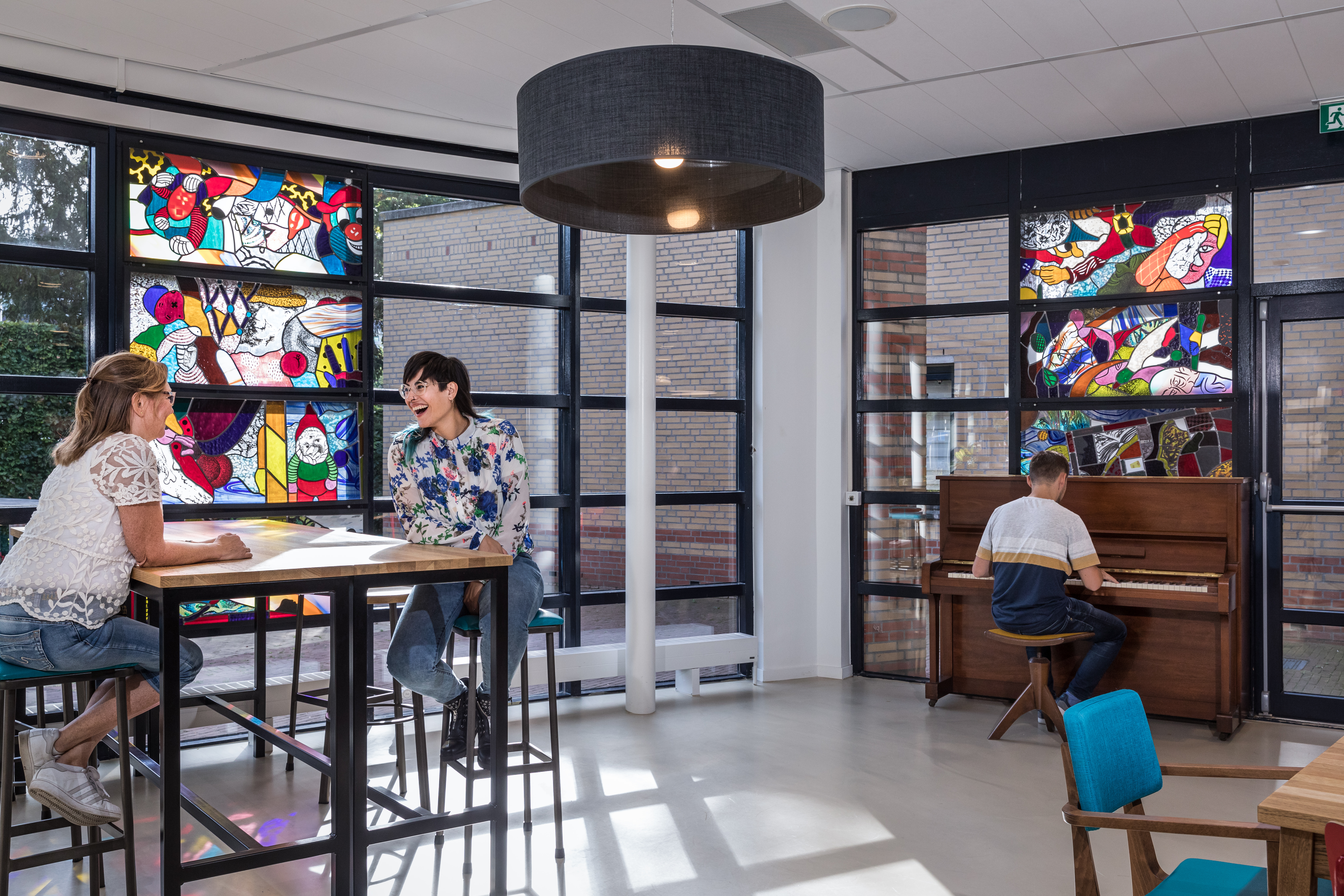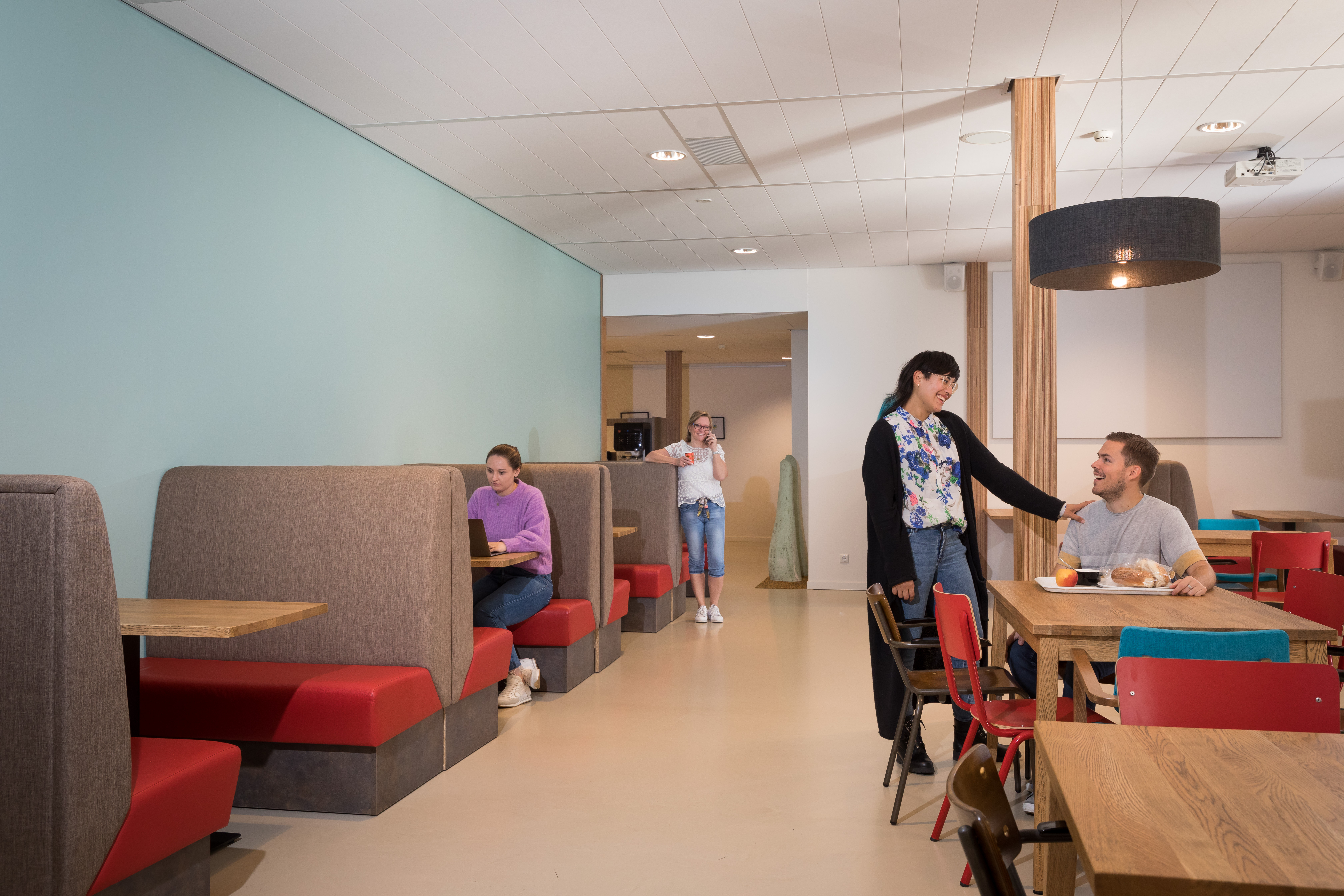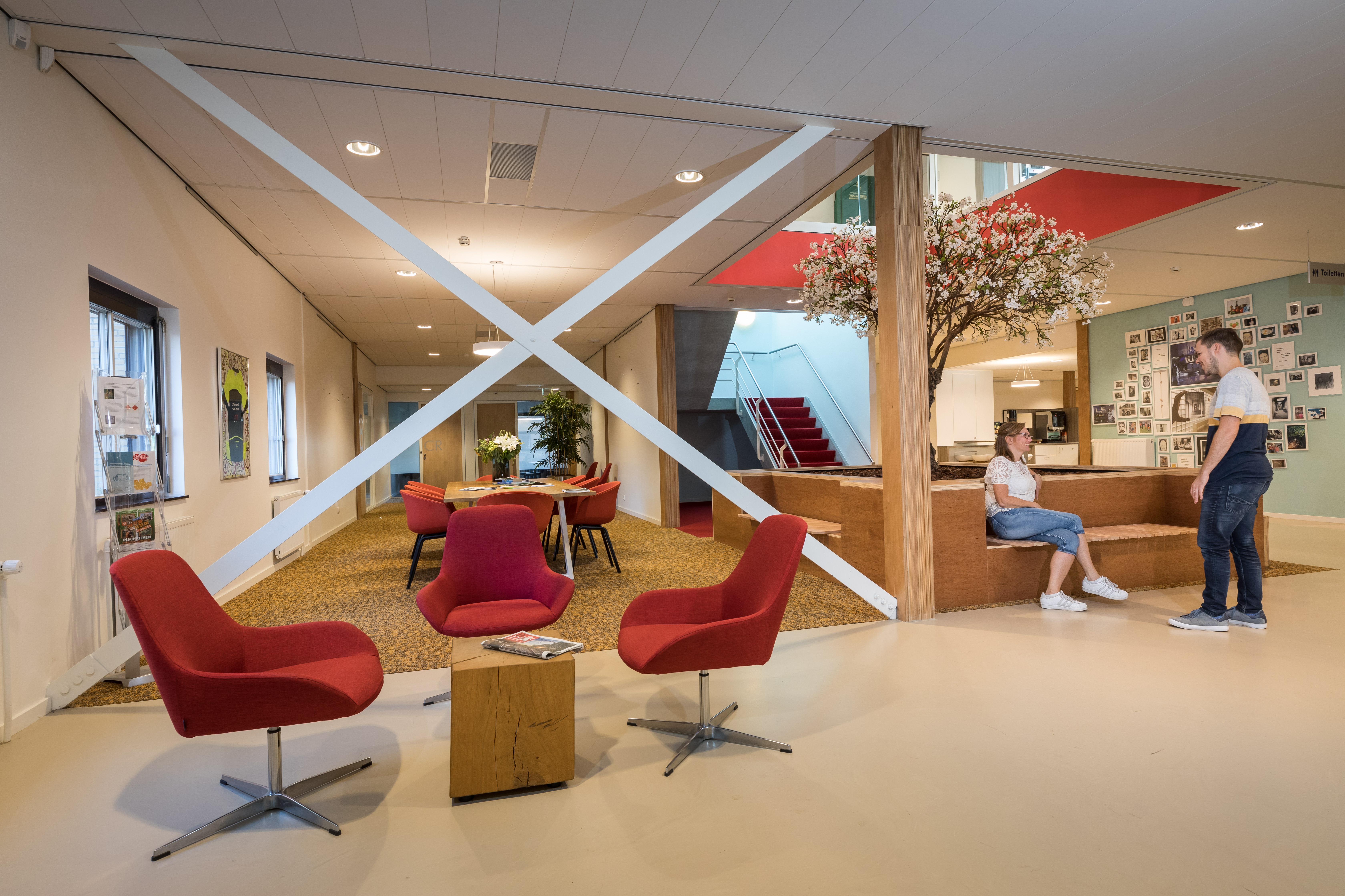 Het werkcafé is tijdens kantooruren toegankelijk voor medewerkers en cliënten. Hier kan men naast de lunch en koffie ook informeel overleggen.