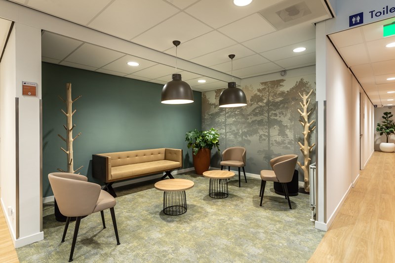 Op de begane grond vind je naast de receptie diverse kleine zithoeken waar je kunt wachten en lezen. Er is ook een werkplek met een computer. Het gebouw is rolstoelvriendelijk, er is een invalidentoilet beneden en er zijn 2 liften aanwezig. Naast de behandelkamers zijn er ook ruimtes voor muziektherapie, ontspanning en fysiotherapie. De SHL prikpost (voor bloedafname) is toegankelijk voor iedereen.
